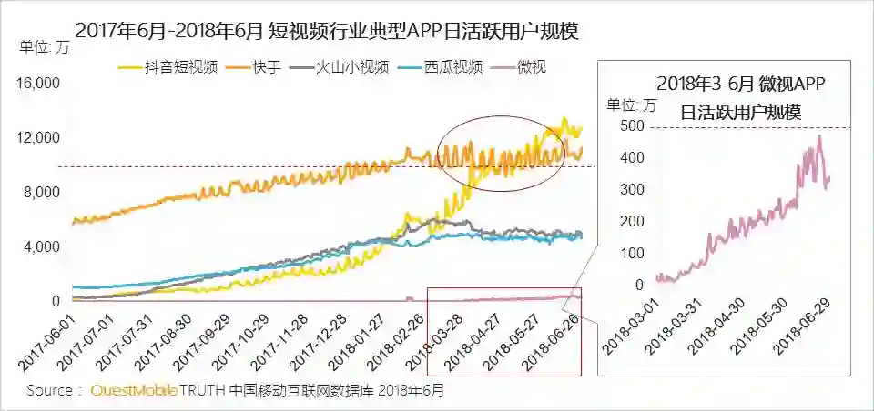 在头条系三款产品的围剿下,快手DAU仍稳定在亿级以上,抖音短视频自上线以来经过20个月的发展,日活破亿;微视迅速崛起,日活近500万仅用3个月时间。
