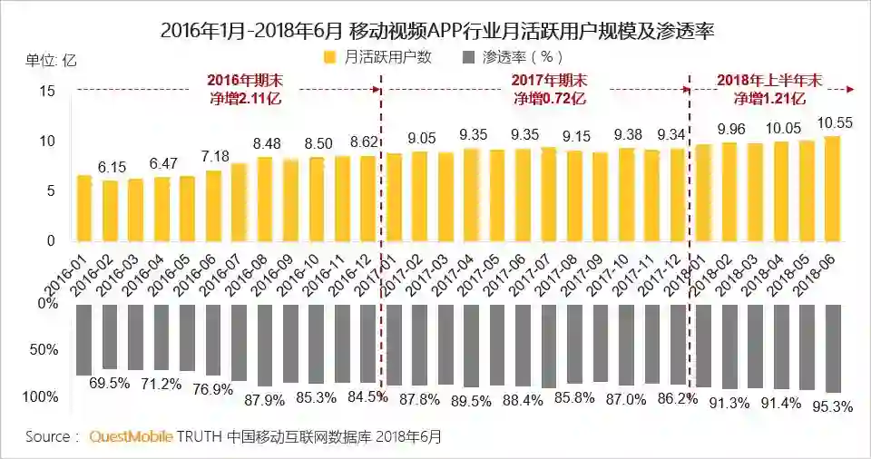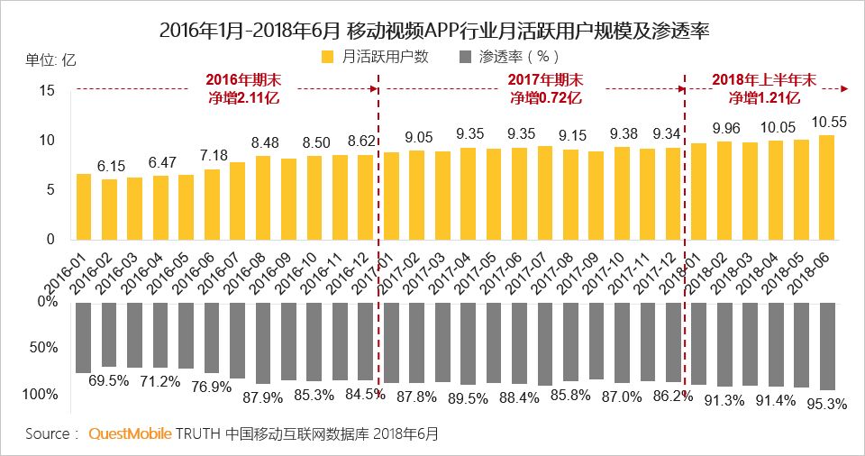 I、得益于短视频增长拉动,2018年上半年移动视频行业渗透率超95%