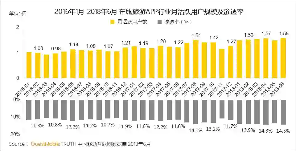 I、2018上半年,在线旅游APP行业月活跃用户规模稳定在1.5亿以上