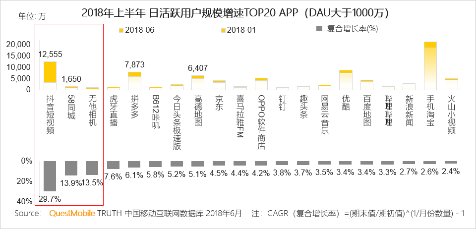 2.5 日活跃用户规模在1000万以上的APP中,抖音短视频、58同城和无他相机位列复合增长率三甲