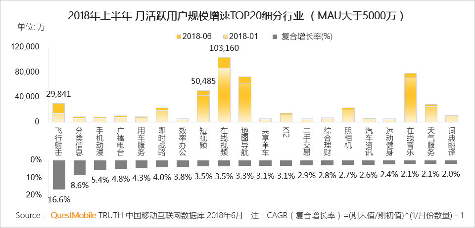 2.4 以“吃鸡”为代表的飞行射击游戏行业增速最高,亿级用户规模的在线视频、短视频也表现不俗