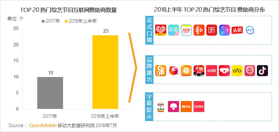 2018年上半年TOP20综艺节目中,互联网企业参与赞助了3/4的节目,主要赞助形式有花式口播、品牌露出等。