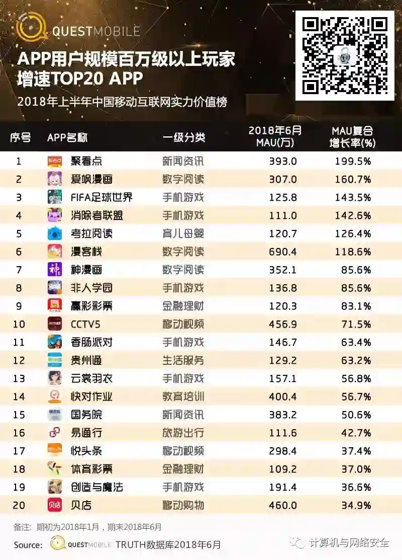 4、APP用户规模百万级以上玩家增速TOP20 APP