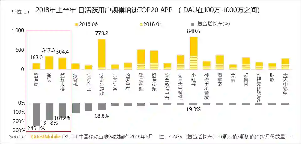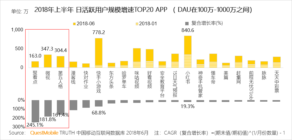 到2018年6月DAU在100万-1000万的APP中增长最快的是聚看点,这得益于社交裂变和平台补贴;微视受到腾讯大力扶持,到了2018年6月,日活跃用户规模已经接近350万。