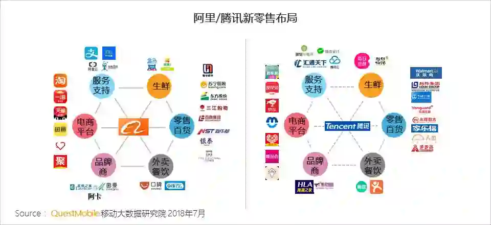 2017年以来,阿里、腾讯加大新零售布局力度,二者的布局思路和打法差异明显,阿里构建的是以自己为中心的强连接体系,而腾讯主要进行赋能,构建的是去中心化的弱连接体系。