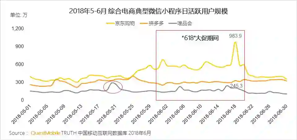 大促日多渠道同步活动,对小程序同样具有良好的拉动作用:618当天,京东购物小程序日活暴增,唯品会616大促当天小程序日活跃用户规模达到峰值。