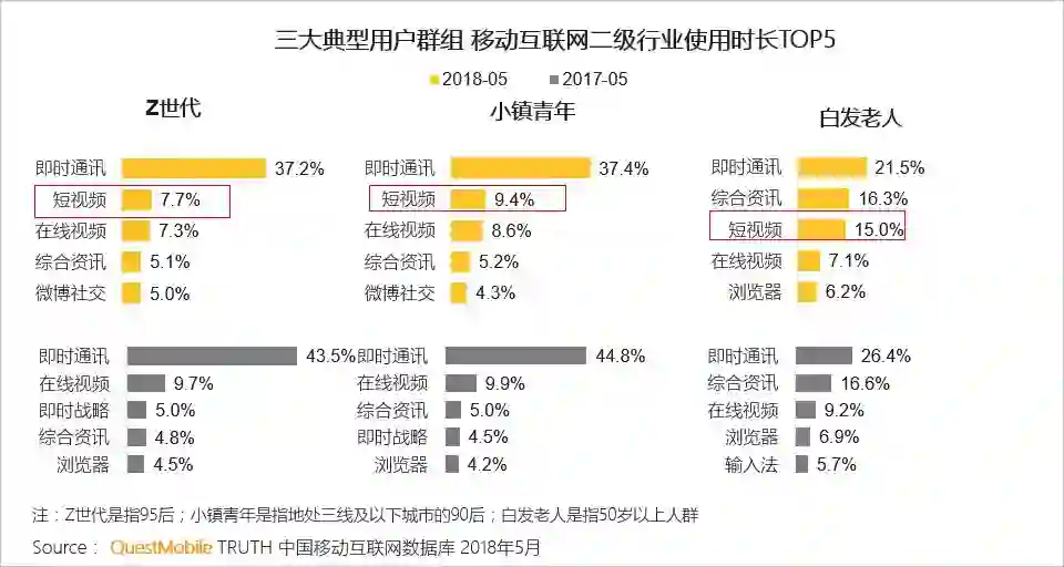 3.5 三大典型群组在即时通讯的时长占比均有所下降,短视频老少皆宜且增长迅猛