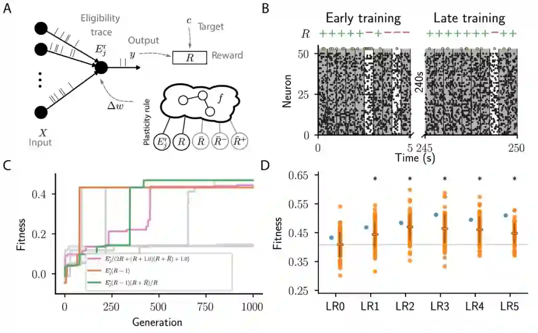 在这样做的过程中,算法表现出了惊人的创造力:「例如,算法发现了一个新的可塑性模型,其中我们定义的信号被组合成一个新信号。事实上,我们观察到使用这个新信号的网络比以前比使用已知规则的网络学习得更快。」该研究的共同第一作者、RIKEN 脑科学中心的 Maximilian Schmidt 博士强调说。