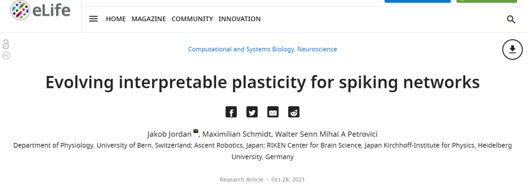 该研究以「Evolving interpretable plasticity for spiking networks」为题,于 2021 年 10 月 28 日发表在《eLife》杂志上。