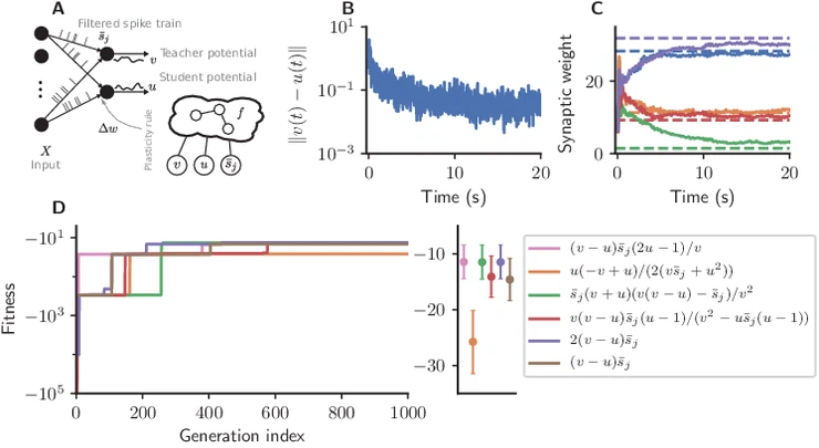使用遗传编程 (GP) 作为一种进化算法,来发现尖峰神经元网络中的可塑性规则。GP 将突变和选择压力应用于最初随机的计算机程序群,以人工进化具有所需行为的算法。考虑到数学表达式的演变,研究人员采用特定形式的 GP:笛卡尔遗传编程(Cartesian genetic programming,GCP)。