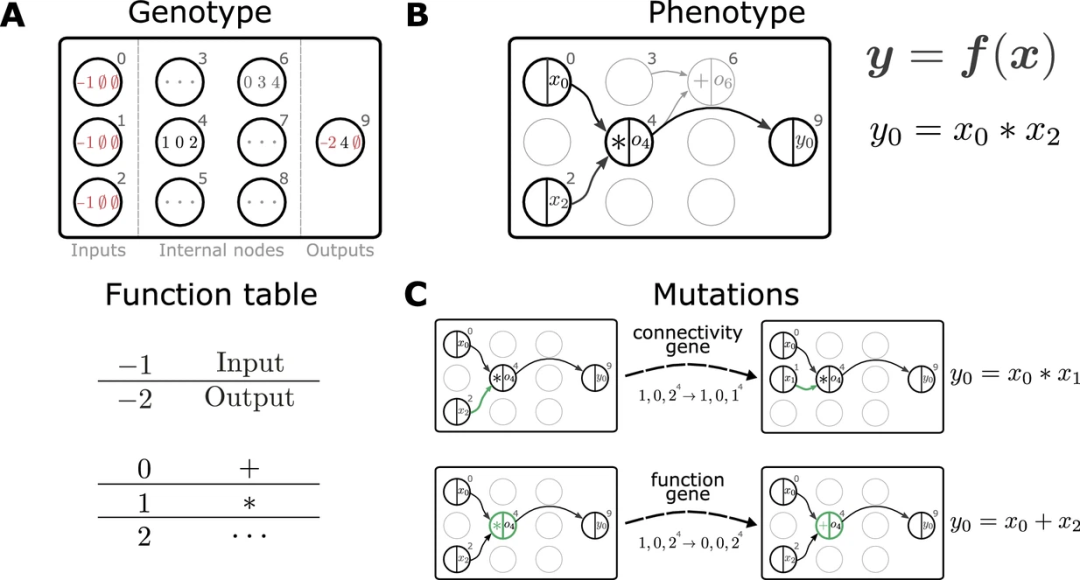 图示:笛卡尔遗传编程中数学表达式的表示和变异。(来源:论文)