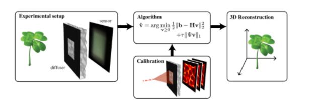 DiffuserCam的物理结构很简单,容易制作,软件则很复杂,不过也易于复制到不同的设备上,方便使用者自行设计使用。在一次校准之后,使用算法来计算地重建3D图像,3D重构的过程相当于在一定的先验下对线性方程求逆。