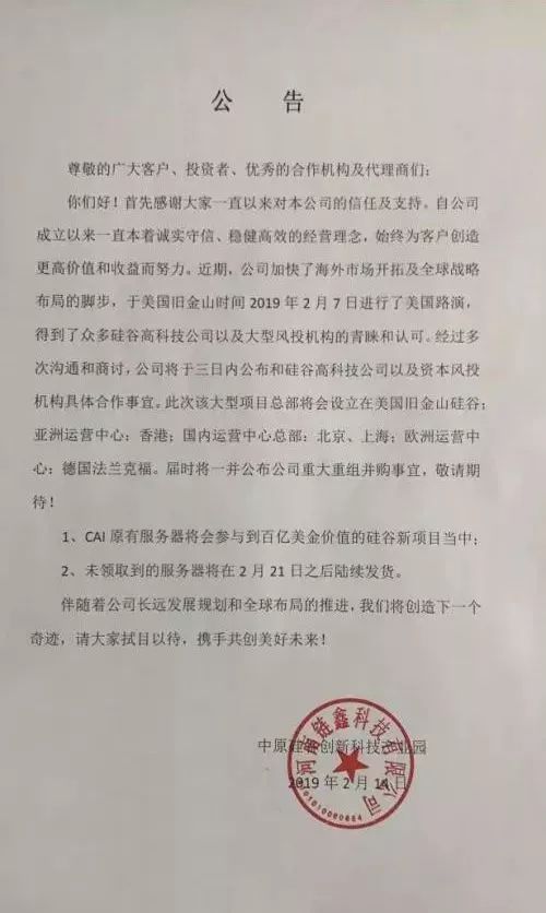 2月17日,链鑫公司则在公告中称,公司于旧金山时间2019年2月7日进行了美国路演,得到众多硅谷高科技公司和风投机构的青睐,决定将公司总部迁往美国旧金山硅谷,并承诺,“美国硅谷科技公司”将按照市场价回收CAI币……