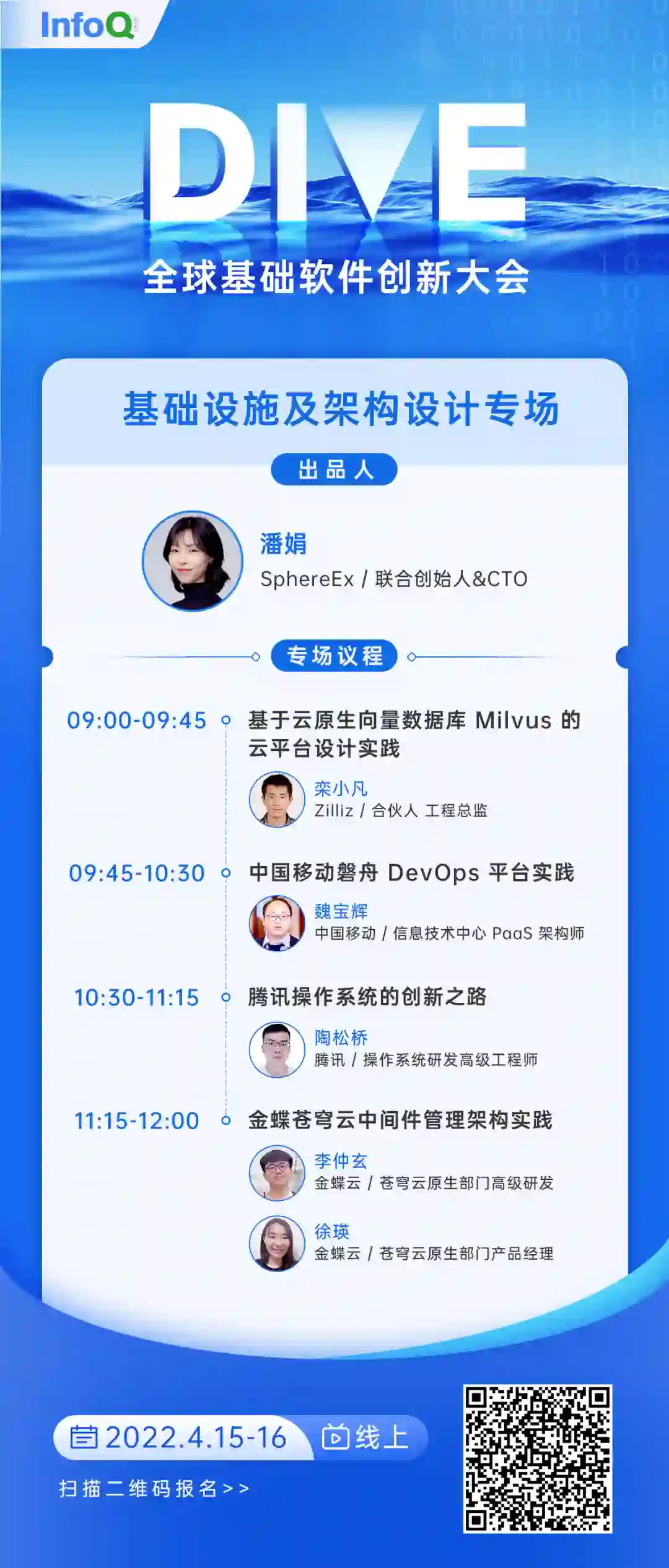 在 4 月 15、16 日,DIVE 全球基础软件创新大会(线上)上,「基础设施及架构设计 」专场邀请 SphereEx 联合创始人 &CTO 潘娟 担任出品人,携手来自 Zilliz、中国移动、腾讯和金蝶云的五位资深技术专家,分别讲述自己在云平台、DevOps、操作系统和中间件设计、管理方面的实战经验,畅聊如何做好基础设施架构设计这件事!
