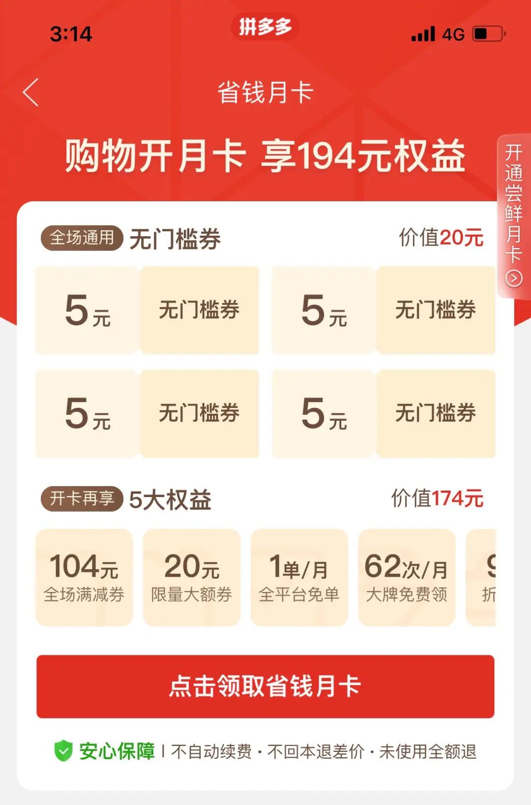 同样,拼多多也有省钱月卡的机制,我也办了,下面就来说说我的真实经历——