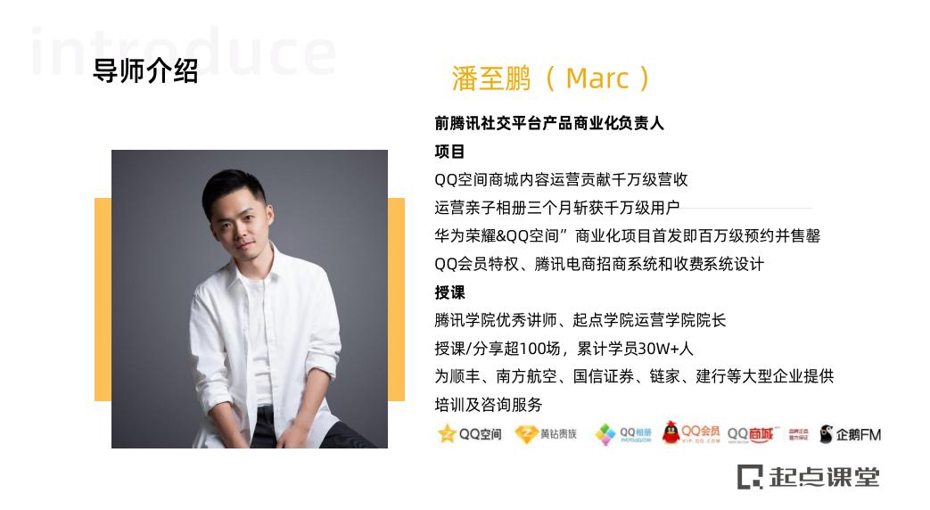 潘至鹏老师作为一个有着近15年运营实战经验导师,05年入职腾讯,任职10年,从实习生晋升为高级运营经理,见证了多款亿万级用户产品成长的全过程,对于运营有着深厚独到的见解。
