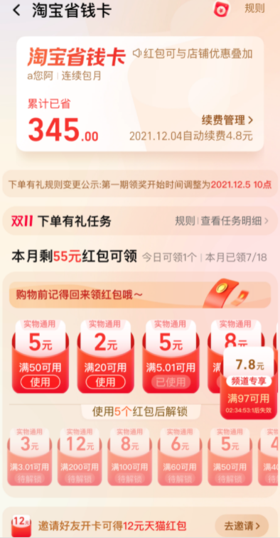 淘宝除了88VIP以外,还推出了“淘宝省钱卡”,首月只需要4.8元,就可以领取共101元的红包,但是每个红包需要有门槛,例如:满110减8、满80减7……