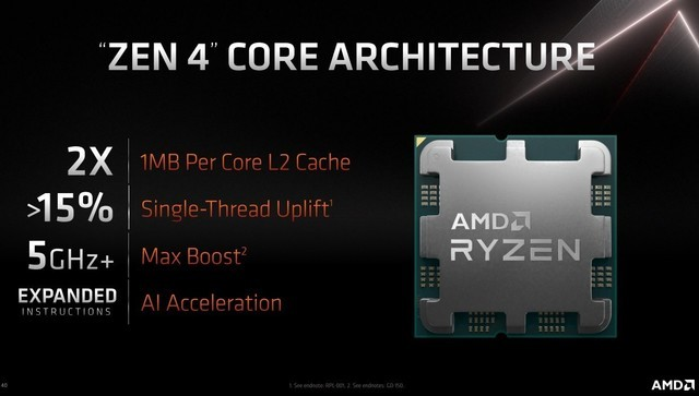 据悉 ZEN4 架构将为锐龙 7000 处理器带来极大的性能提升,每个核心的二级缓存对比上代提升一倍,达到了 1MB,同时单线程性能直接提升 15% 以上,而且频率将超过 5GHz,官方演示中甚至达到了 5.5GHz,此外 AMD 还为内容创作者引入了 AI 加速指令集。