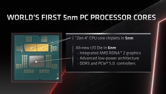 ZEN4 架构这次将使用 5nm 工艺打造核心,I/O Die 也从 12nm 升级到了 6nm 并使用先进的低功耗架构。还将集成 RNDA2 架构核心显卡,支持 DDR5 和 PCIe 5.0。