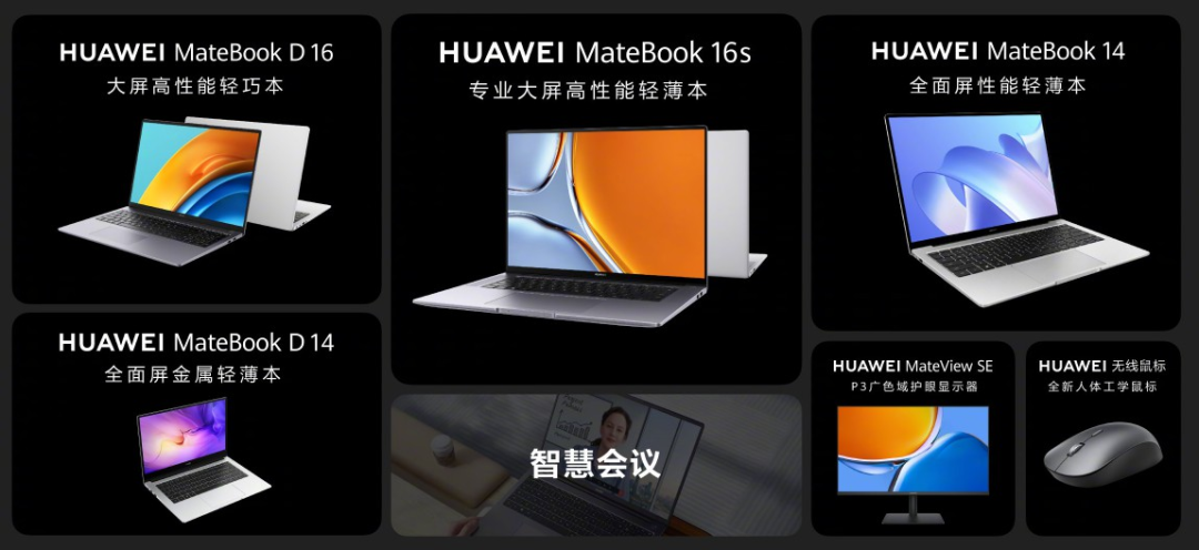 华为 MateBook 系列新品发布会如期召开,全球首款 i9 Evo 认证笔记本电脑华为 MateBook 16s i9 版本、华为首款大屏高性能轻巧本华为 MateBook D 16、华为 MateBook 14、华为 MateBook D 14、华为显示器新成员华为 MateView SE 以及全新华为无线鼠标同台发布。