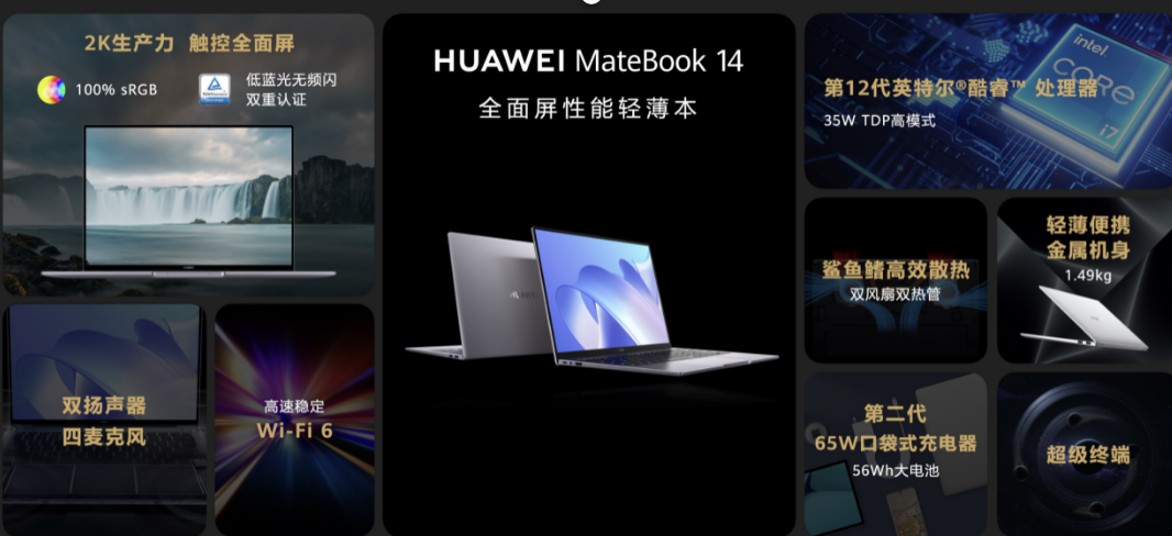 华为 MateBook 14 也是 12 代英特尔酷睿 i7,标配 2K 触控全面屏,屏占比达 90%,支持 100%sRGB 色域。整机重 1.49kg,最厚处 15.9mm。华为 MateBook D 14 同样是 12 代英特尔酷睿 i7,具体型号可能略有差别。功能方面,支持超级终端智慧功能,包括多设备协同互联、智慧搜索、智慧语音、华为分享等。