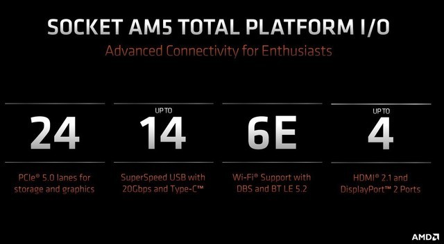 这次 ZEN4 也将升级插槽,从 AM4 升级到 AM5,采用 LGA 1718 插槽,支持 PCIe 5.0 和 DDR5,兼容 AM4 时期的散热器。AM5 将提供 24 条 PCIe 5.0 通道,4 个 USB 3.2 20Gbps 接口,支持 Wi-Fi 6E 和蓝牙 5.2,HDMI 2.1 以及 DP 2.0。