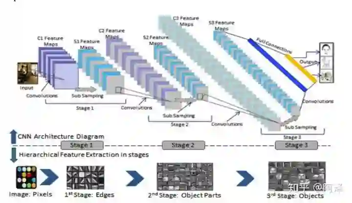 PS:CNN 有三大特点,除了上面说的局部连接和参数共享之外,还有 「层次化表达(Hierarchical Expression)」。CNN 的层次化表达可以通过卷积层叠加得到,每一个卷积层都是在前一层的基础上进行的,这样的意义在于,网络越往后,其提取到的特征越高级。比如说:第一层可能是一些线条,第二层可能会是一些纹理,第三层可能是一些抽象图案: