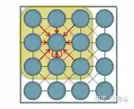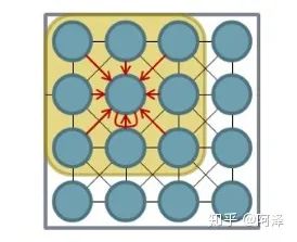 我们知道对于 CNN 来说,其核心在于使用了基于卷积核的卷积操作来提取图像的特征,这里的卷积操作类似于对 「计算区域内的中心节点和相邻节点进行加权求和」: