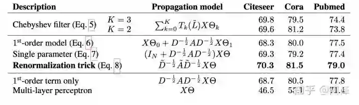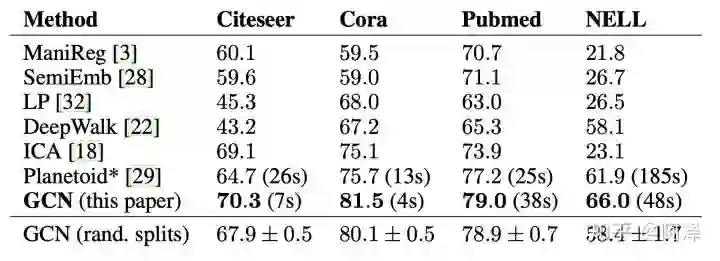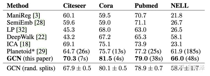 可以看到 GCN 的结果在不同数据集上都取得了非常好的效果,远超其他模型。