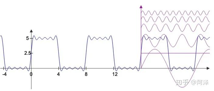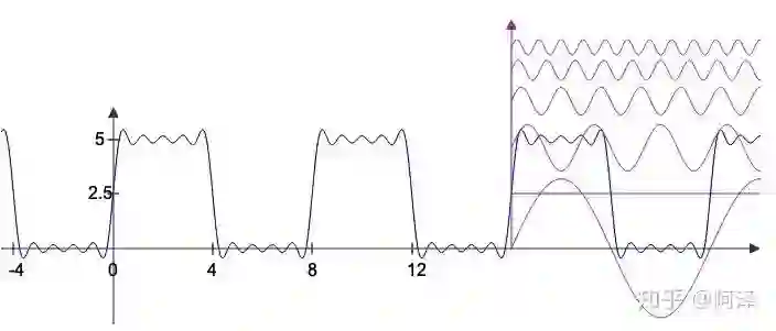 左边是一个周期函数,右边是将周期函数分解成多个简单震荡函数,所以这个周期函数用数学公式可以表达为: