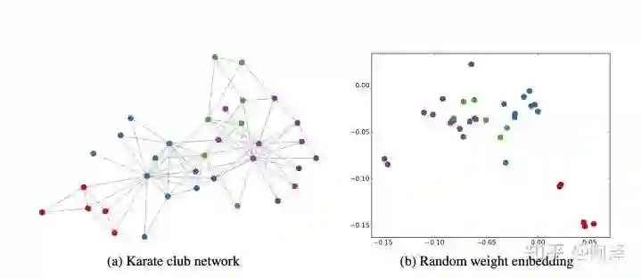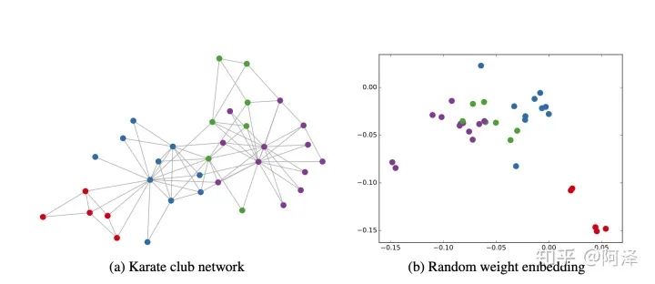 GCN 还有除了训练后模型精度高外,还有两个非常硬核的地方,即使不训练,直接随机参数也可以获得不错的效果,下图展示了在某一数据集下随机赋权值的结果: