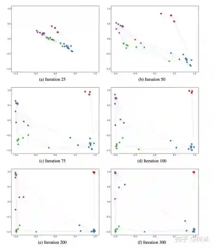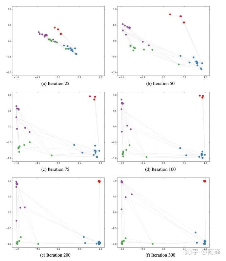 另外,作为半监督学习,GCN 可以在只标注少量样本的情况下学得出色的效果,下图为每个类别只标注一个样本的分类结果: