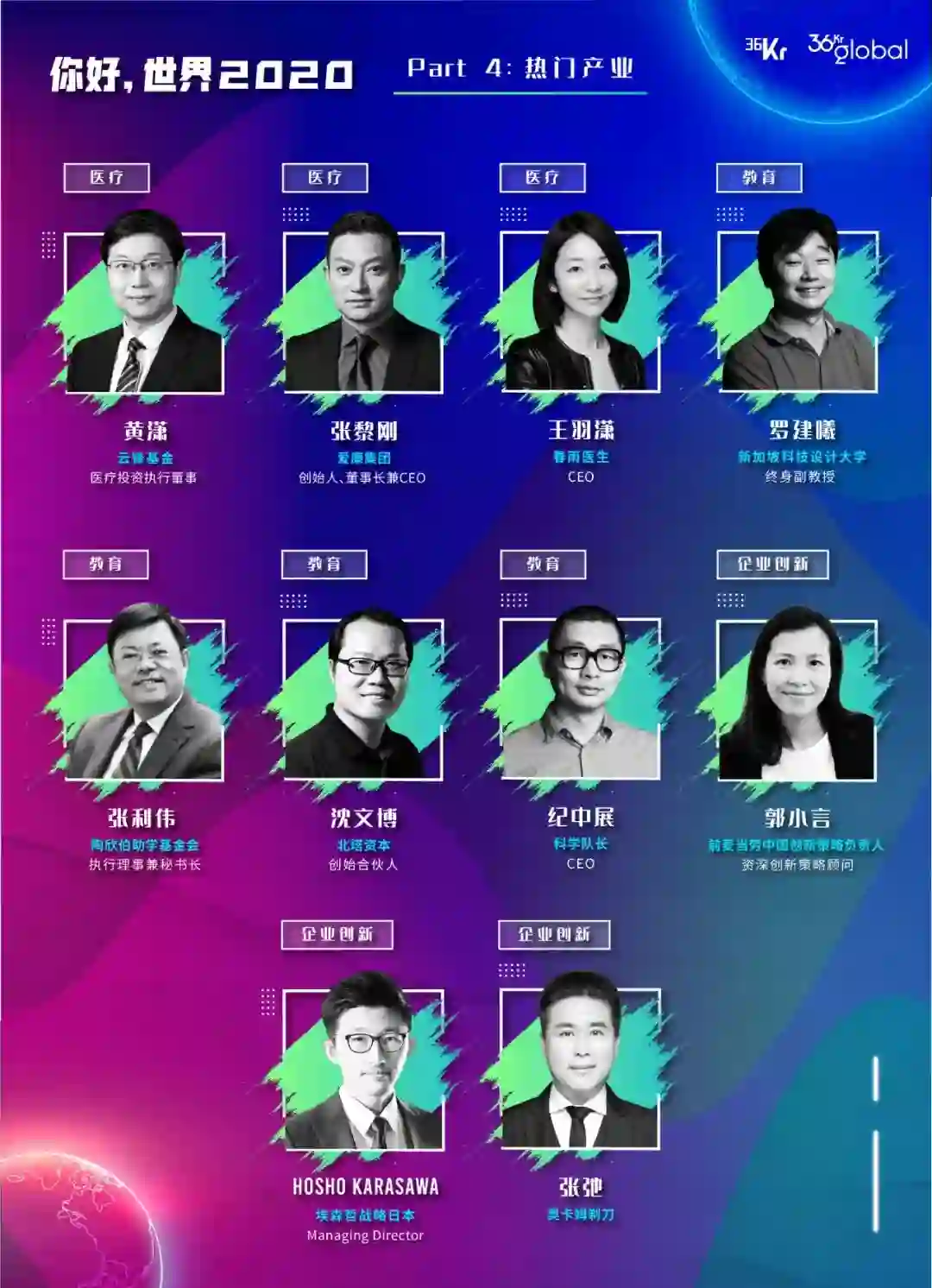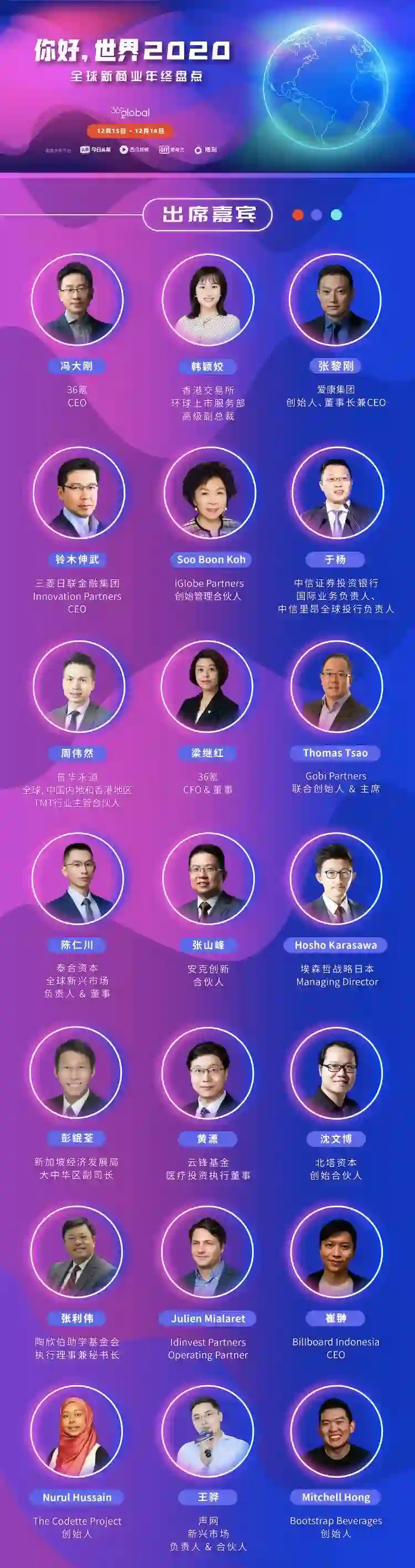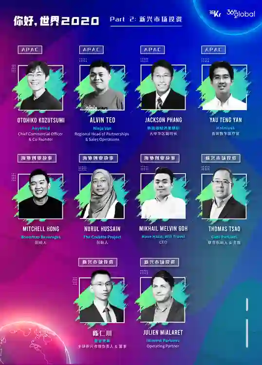 2020年12月15、16日,36Kr Global 将推出「你好,世界 2020」年终盛典,其中分为四个主题,Part 1“2020全球商业盘点“(已于11月2日发布),Part 2“新兴市场创投”,Part 3“中国企业全球化“,Part 4“热门产业趋势”。我们希望透过投资人和商业领跑者们的视角,洞察今日的机遇与挑战,谋划通向未来的前路与征程。