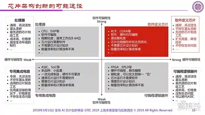 在今年的全球AI芯片峰会GTIC 2019上,魏少军教授曾展示这样一张PPT。他将芯片分成三部分:第一部分是可更多编程的,如CPU;第二部分是能少量编程的,如GPU;第三部分是不能编程的,如专用芯片。