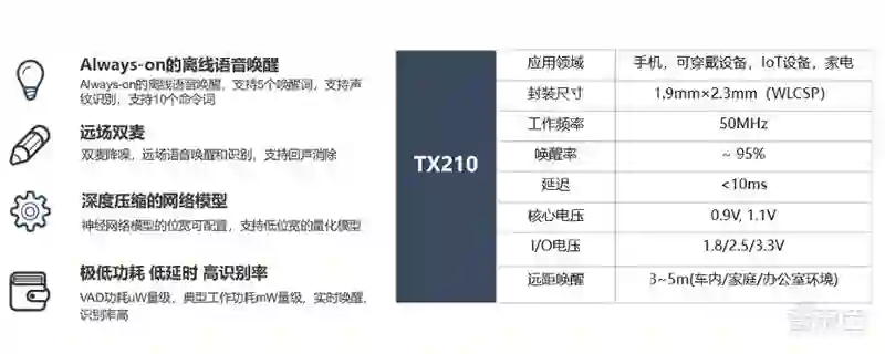 经过多重优化,TX210将工作功耗控制在2mW内,将语音活动检测(Voice Activity Detection,VAD)功耗降至100uW内。