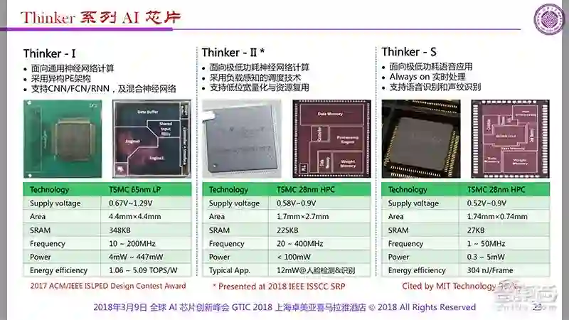 这三款芯片的设计方案一问世,就收获了国际学术界的认可。比如Thinker-I首次出现在2017VLSI国际研讨会上时,外界评价它“突破了神经网络计算和访存瓶颈,实现了高能效多模态混合神经网络计算。”