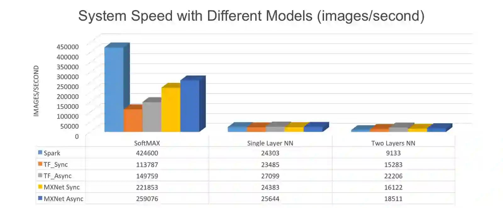 该图展示了 DNN 在各个平台上的速度。相比于单层神经网络,当发展到两层神经网络时,由于需要更多的迭代计算,Spark 的性能下降。我们将模型参数存储在 Spark 的驱动器中,因为驱动器可以容纳这些参数。但是如果我们使用 RDD 保持参数,并在每次迭代后做更新,结果可能会更差。