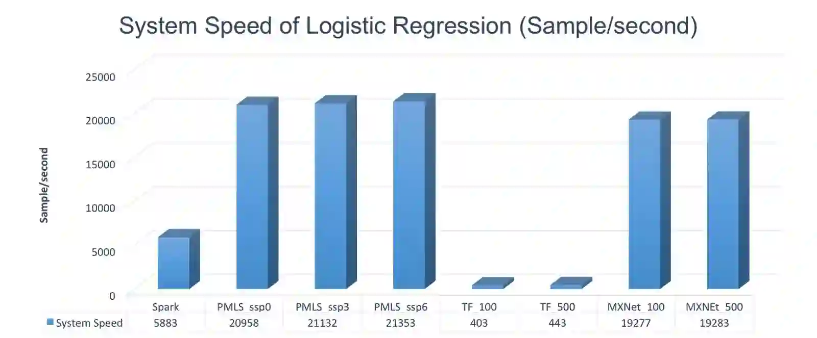 该图展示了各个平台对逻辑斯蒂回归的计算速度。PMLS 和 MXNet 是最快的两个系统,TensorFlow 速度最慢,而 Spark 介于两者之间。 对此,我们分析认为是由多个原因导致的。首先,相比于 Spark 和 TensorFlow,PMLS 是一个轻量级系统,它是采用高性能 C++ 编程语言实现的,而 Spark 是使用运行在 JVM 上的 Scala 语言编写的。其次,PMLS 中包含的抽象较少,而 TensorFlow 中则具有过多的抽象。抽象增加了系统的复杂度,并导致运行时开销。