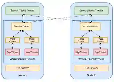 PMLS 也采用了 SSP(Stale Synchronous Parallelism)模型。相比于 BSP(Bulk Synchronous Parellelism)模型 ,SSP 放宽了每一次迭代结束时各个机器需做同步的要求。为实现同步,SSP 允许工作者间存在一定程度上的不同步,并确保了最快的工作者不会领先最慢的工作者 s 轮迭代以上。由于处理过程处于误差所允许的范围内,这种非严格的一致性模型依然适用于机器学习。我曾经发表过一篇博文专门介绍这一机制。