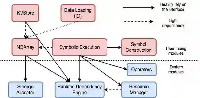 MXNet 是一个协同开源项目,源自于在 2015 年出现的 CXXNet、Minverva 和 Purines 等深度学习项目。类似于 TensorFlow,MXNet 也是一种数据流系统,支持具有可变状态的有环计算图,并支持使用参数 - 服务器模型的训练计算。同样,MXNet 也对多个 CPU/GPU 上的数据并行提供了很好的支持,并可实现模型并行。MXNet 支持同步的和异步的训练计算。下图显示了 MXNet 的主要组件。其中,运行时依赖引擎分析计算过程中的依赖关系,对不存在相互依赖关系的计算做并行处理。MXNet 在运行时依赖引擎之上提供了一个中间层,用于计算图和内存的优化。