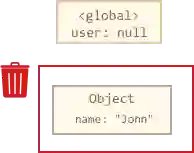 现在 John 变成不可达的了。因为没有引用了,就不能访问到它了。垃圾回收器会认为它是垃圾数据,然后释放内存。