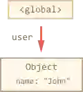 这里的箭头描述了一个对象引用。全局变量 “user” 引用了对象 {name:”John”}(为简洁起见,我们称它为 John)。John 的 “name” 属性存储一个原始值,所以它被写在对象内部。