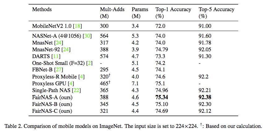 不同模型在 ImageNet 数据集上的性能对比如下表 2 所示。实验结果表明:在同样的搜索空间设置下,FairNAS-A 实现了新的 SOTA 结果——在 Imagenet 1k 分类数据集上的 top-1 准确率达到 75.34%;在同等 multiply-adds 的情况下,FairNAS-A 的 top-1 准确率高出 MnasNet-92 0.55%,高出 Single-Path-NAS 0.38%。
