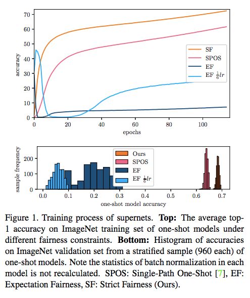 如上图所示,实验结果表明,在严格的公平性约束下,one-shot 模型在 ImageNet 训练集上的平均准确率稳步提升,没有出现振荡。与 [2] 相比,one-shot 模型的分层样本的准确率范围大大缩小。这是一个重大进展,研究者在快速评估模型的同时也能保证准确性。