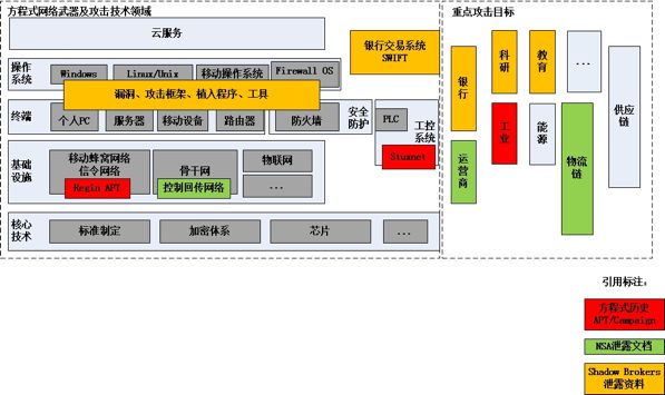 从历史泄露的方程式资料分析,其具备的网络攻击能力是全方位的,下图是根据泄露 NSA 资料和公开情报整理的其网络武器及攻击技术所覆盖的领域和目标。