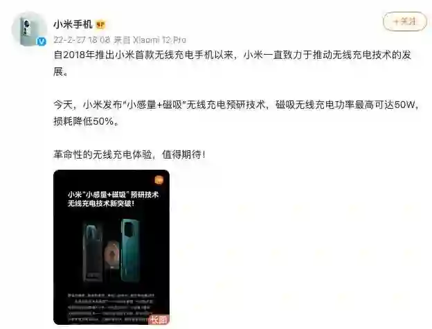 27日,小米发布“小感量+磁吸”无线充电预研技术。据介绍,磁吸无线充电功率最高可达50W,损耗降低50%。