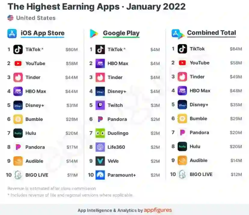 AppFigures最新数据显示, TikTok 1月在App Store和Google Play的净收入总额达6400万美元,成为2022年1月美国市场收入最高的App。