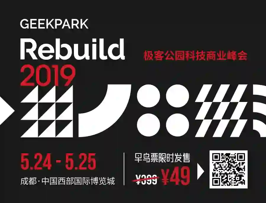 2019 年 5 月 24 日-25 日,GeekPark Rebuild 2019 科技商业峰会空降成都·中国西部国际博览城,重磅嘉宾陆续更新中,立即扫描下方二维码或点击「阅读全文」购买 Rebuild 2019 门票,亲临现场!