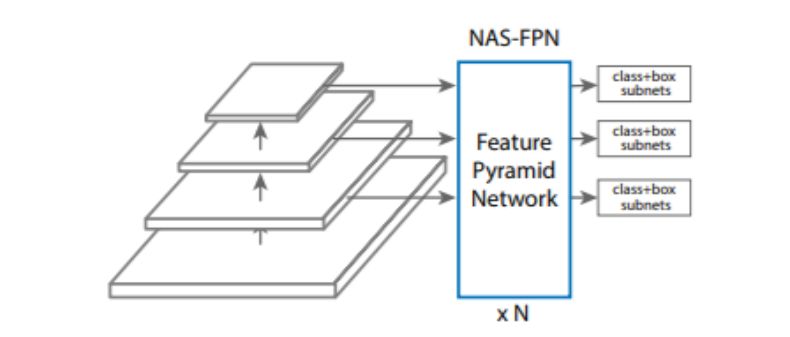 图 2:带有 NAS-FPN 的 RetinaNet。在本文中,特征金字塔网络将由神经架构搜索算法来搜索。骨干网络和用于类和框预测的子网络遵循 RetinaNet [23] 中的原始设计。FPN 的架构可以堆叠多次,以获得更高的准确率。