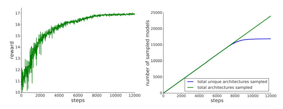 图 5:左:强化学习训练的奖励。计算奖励的方法为在代理任务上采样架构的 AP。右:采样的独特架构数与架构总数。随着控制器逐渐收敛,控制器会采样到越来越多的相同架构。